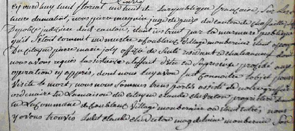 qu'il s'était commit un meurtre à Coublanc, village Monbernier étant accompagné Du citoyen pierre marie joly officier de santé résidant à châteauneuf dont nous