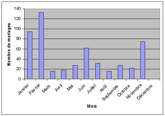 Il faut cependant noter les creux de Mars et Avril, mais surtout de décembre (zéro mariage pour ce mois).