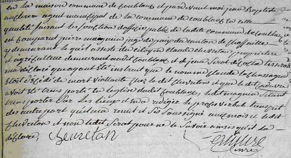 qu'il s'était commit un meurtre à Coublanc, village Monbernier étant accompagné Du citoyen pierre marie joly officier de santé résidant à châteauneuf dont nous