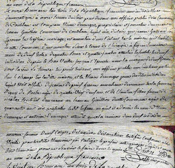 Naissance d’Etienne et d’Antoine DEMURGER (frères siamois) : 11 brumaire an III (01 novembre 1794)